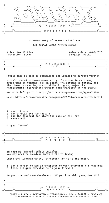 Release Name : Doraemon.Story.of.Seasons.v1.0.2.RIP-SiMPLEX