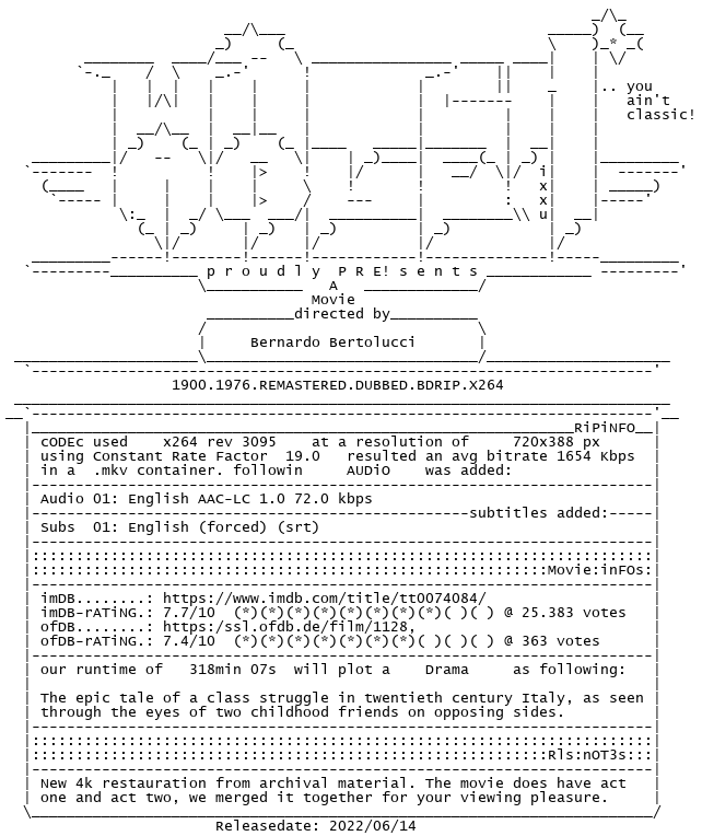 Release Name : 1900.1976.REMASTERED.DUBBED.BDRIP.X264-WATCHABLE