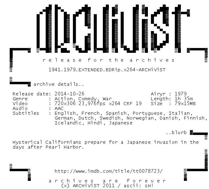 Release Name : 1941.1979.EXTENDED.BDRip.x264-ARCHiViST