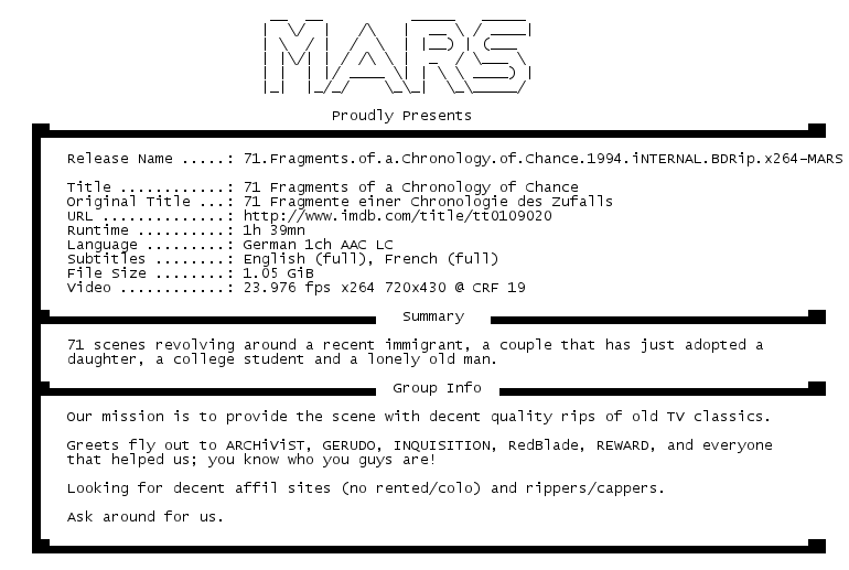 Release Name : 71.Fragments.of.a.Chronology.of.Chance.1994.iNTERNAL.BDRip.x264-MARS
