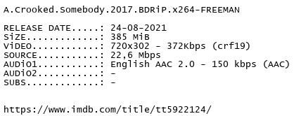 https://multiup.org/download/31f1e236e1b9a9874ba5989aa3e0e54b/A.Crooked.Somebody.2017.BDRiP.x264-FREEMAN.rar