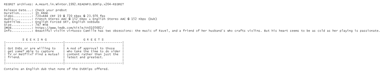 Release Name : A.Heart.in.Winter.1992.READNFO.BDRip.x264-REGRET