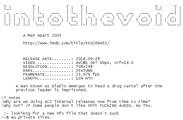 Release Name : A.Man.Apart.2003.iNTERNAL.DVDRip.x264-intothevoid