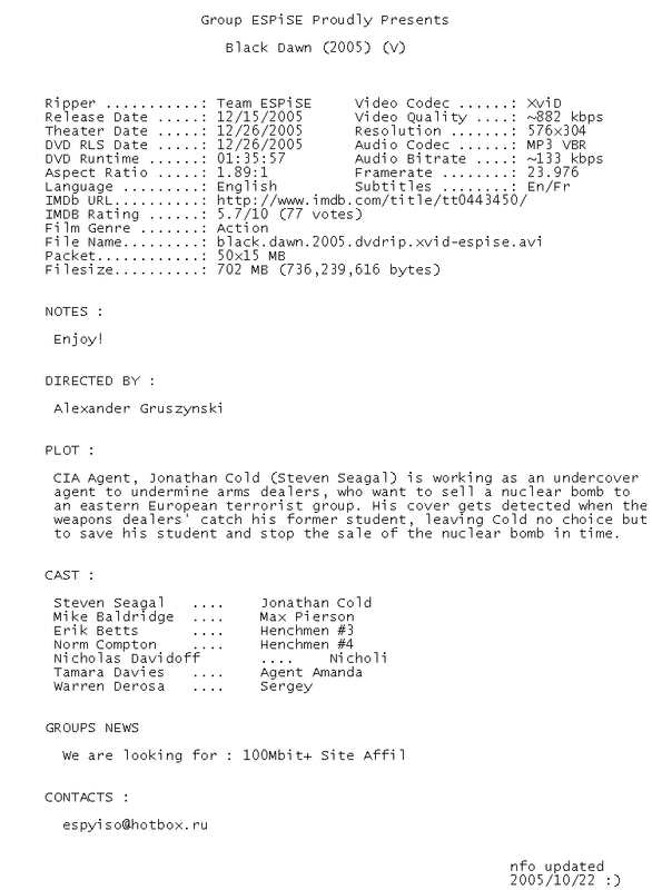 Release Name : Black.Dawn.2005.DVDRip.XviD-ESPiSE