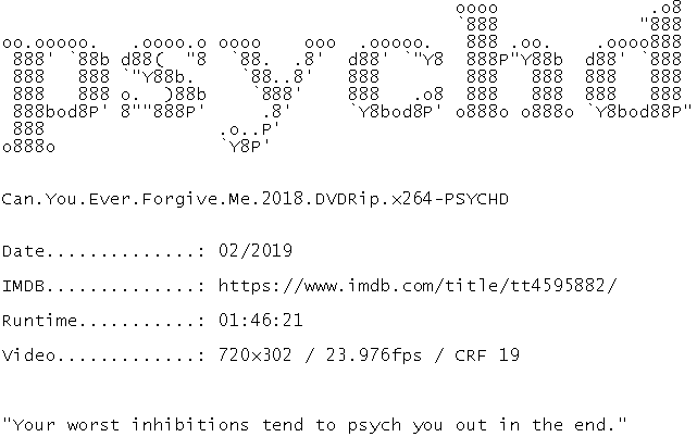 Release Name : Can.You.Ever.Forgive.Me.2018.DVDRip.x264-PSYCHD