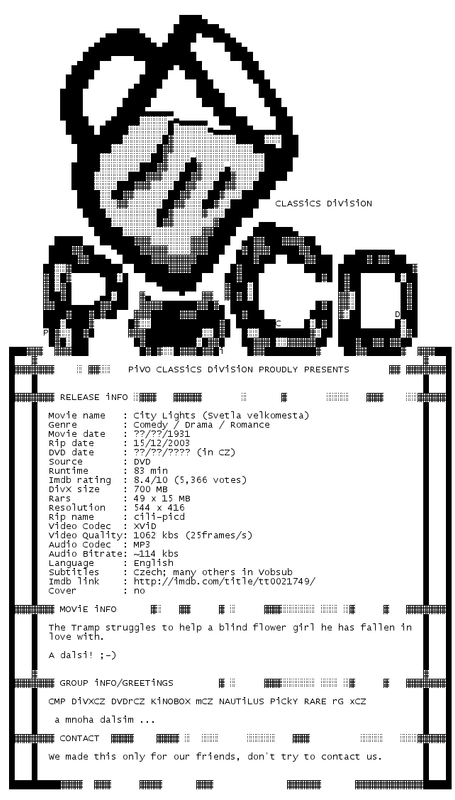 Release Name : City.Lights.1931.DVDRip.XviD.CZSub-PiCD