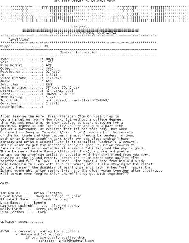 Release Name : Cocktail.1988.WS.DVDRip.XviD-AXIAL