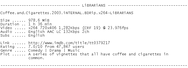 Release Name : Coffee.and.Cigarettes.2003.iNTERNAL.BDRip.x264-LiBRARiANS