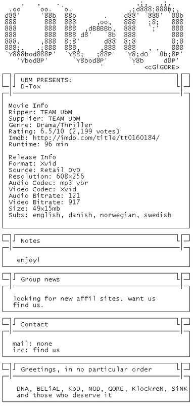 Release Name : D-Tox.2002.INTERNAL.DVDRIP.XVID-UbM