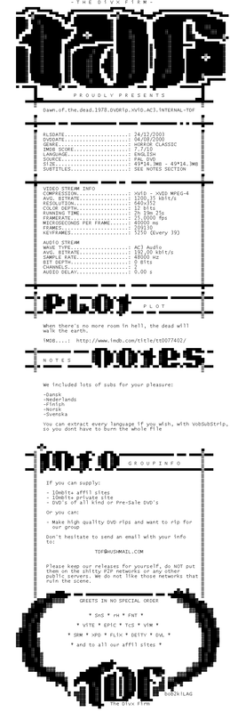 Release Name : Dawn.Of.The.Dead.1978.DVDRip.XViD.AC3.iNTERNAL-TDF