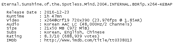 Release Name : Eternal.Sunshine.of.the.Spotless.Mind.2004.INTERNAL.BDRip.x264-KEBAP