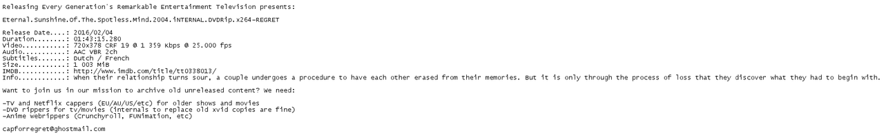 Release Name : Eternal.Sunshine.of.The.Spotless.Mind.2004.iNTERNAL.DVDRip.x264-REGRET