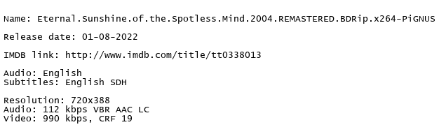Release Name : Eternal.Sunshine.of.the.Spotless.Mind.2004.REMASTERED.BDRip.x264-PiGNUS