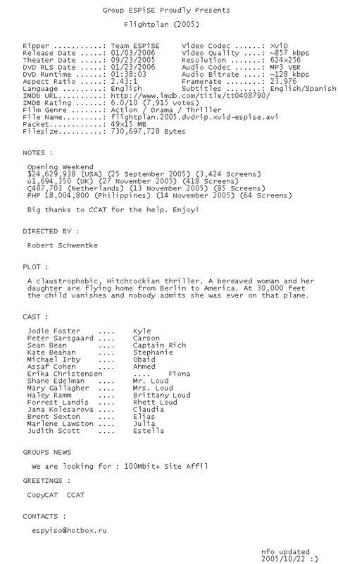Release Name : Flightplan.2005.DVDRip.XviD-ESPiSE