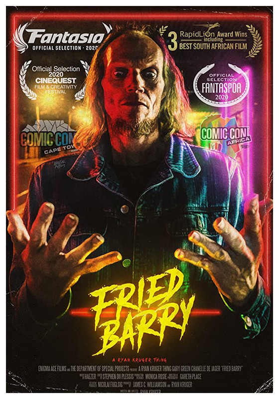 Barry is a drug-addled, abusive bastard who – after yet another bender – is abducted by aliens. Barry takes a backseat as an alien visitor assumes control of his body and takes it for a joyride through Cape Town. What follows is an onslaught of drugs, sex and violence as our alien tourist enters the weird and wonderful world of humankind. FRIED BARRY is based upon the short film of the same name, which earned 57 official selections and 12 wins at festivals around the world.