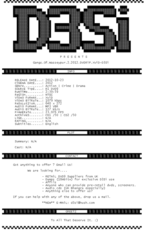 Release Name : Gangs.Of.Wasseypur.2.2012.DVDRiP.XviD-D3Si