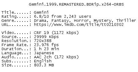 Release Name : Gemini.1999.REMASTERED.BDRip.x264-ORBS