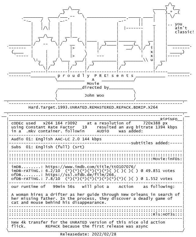 Release Name : Hard.Target.1993.UNRATED.REMASTERED.REPACK.BDRIP.X264-WATCHABLE