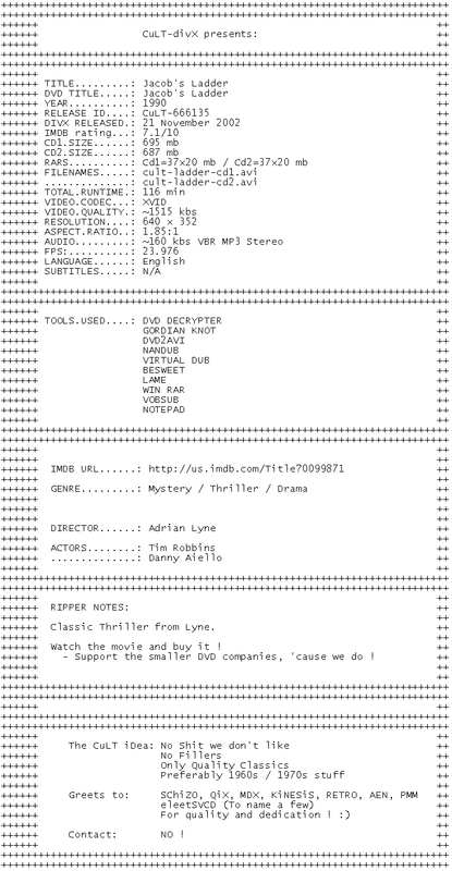 Release Name : Jacobs.Ladder.1990.DVDRip.iNTERNAL.XviD-CuLTdivX