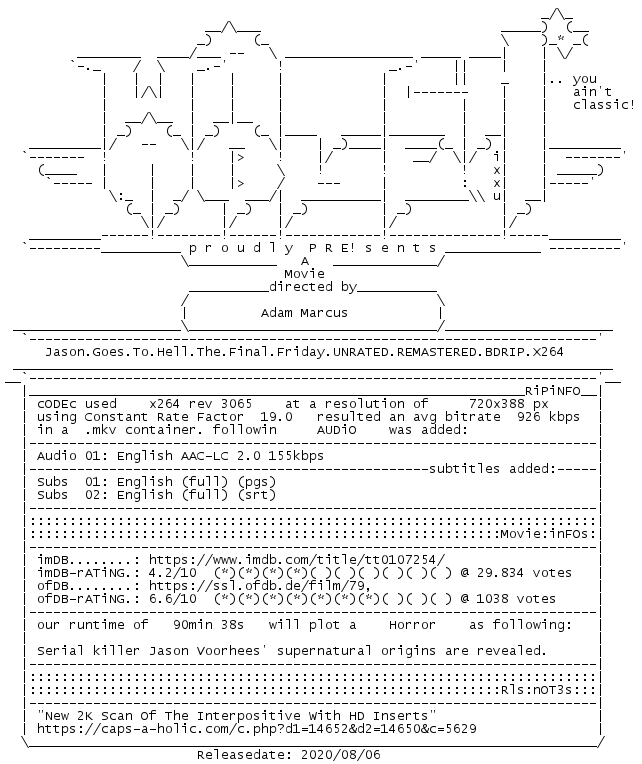 Release Name : Jason.Goes.To.Hell.The.Final.Friday.1993.UNRATED.REMASTERED.BDRIP.X264-WATCHABLE