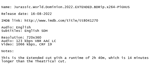 Release Name : Jurassic.World.Dominion.2022.EXTENDED.BDRip.x264-PiGNUS