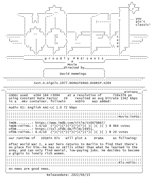 Release Name : Just.A.Gigolo.1977.REMASTERED.DVDRIP.X264-WATCHABLE