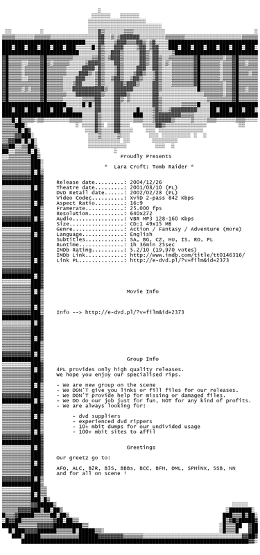 Release Name : Lara.Croft.Tomb.Raider.2001.iNTERNAL.DVDRip.XviD-4PL