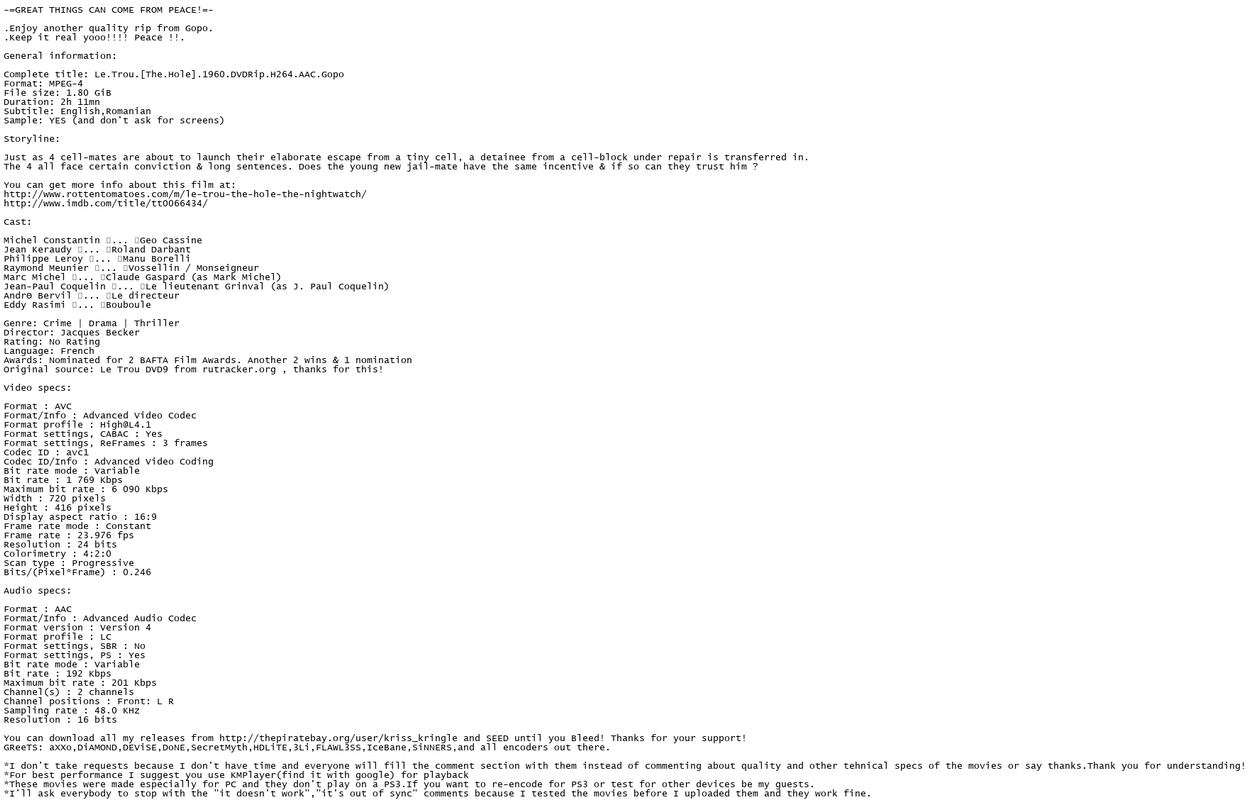 https://rapidgator.net/file/2cdd606c142b0aaf37ed0712b9c7fa11/Le.Trou.The.Hole.1960.DVDRip.H264.AAC-Gopo.rar.html