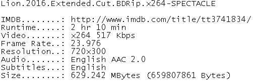 Release Name : Lion.2016.Extended.Cut.BDRip.x264-SPECTACLE