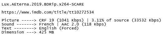 Release Name : Lux.AEterna.2019.BDRip.x264-SCARE