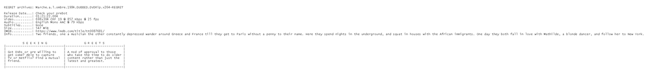 Release Name : Marche.a.l.ombre.1984.DUBBED.DVDRip.x264-REGRET
