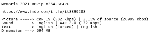 Release Name : Memoria.2021.BDRip.x264-SCARE
