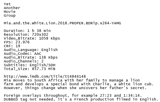 Release Name : Mia.and.the.White.Lion.2018.PROPER.BDRip.x264-YAMG
