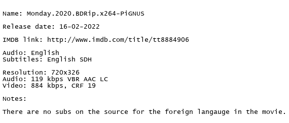 Release Name : Monday.2020.BDRip.x264-PiGNUS