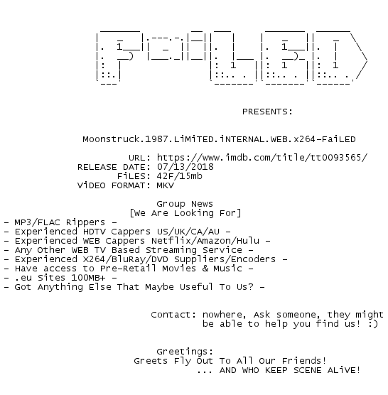 Release Name : Moonstruck.1987.LiMiTED.iNTERNAL.WEB.x264-FaiLED
