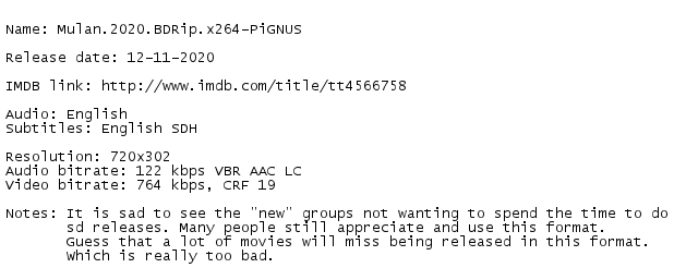 Release Name : Mulan.2020.BDRip.x264-PiGNUS