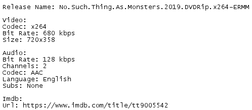 http://www.filefactory.com/file/15vwskup3v92/No.Such.Thing.As.Monsters.2019.DVDRip.x264-ERMM.rar