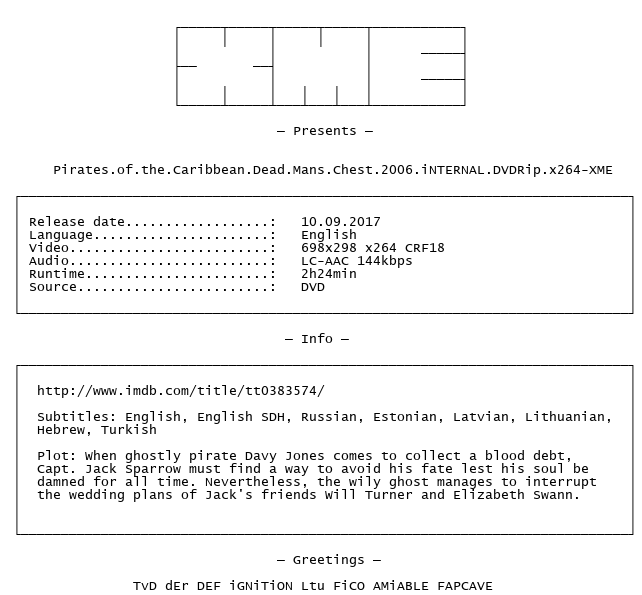 Release Name : Pirates.of.the.Caribbean.Dead.Mans.Chest.2006.iNTERNAL.DVDRip.x264-XME