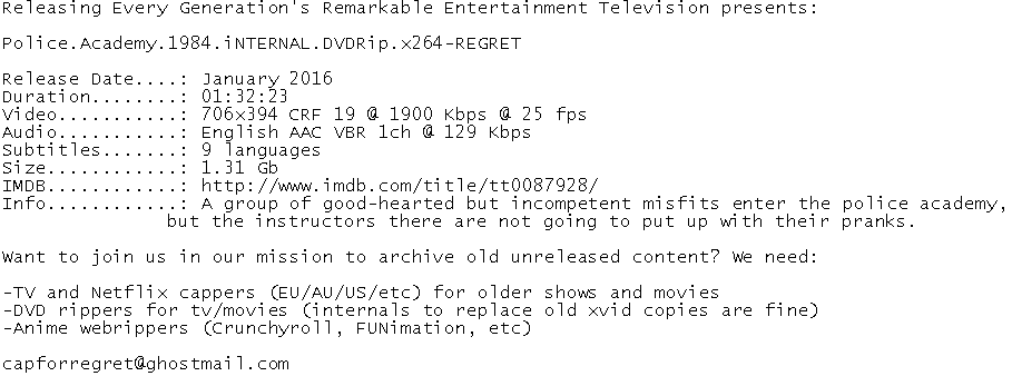 Release Name : Police.Academy.1984.iNTERNAL.DVDRip.x264-REGRET