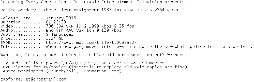 Release Name : Police.Academy.2.Their.First.Assignment.1985.iNTERNAL.DVDRip.x264-REGRET