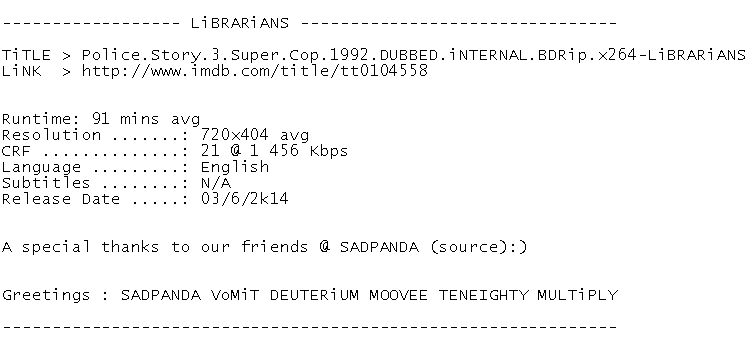 Release Name : Police.Story.3.Super.Cop.1992.DUBBED.iNTERNAL.BDRip.x264-LiBRARiANS