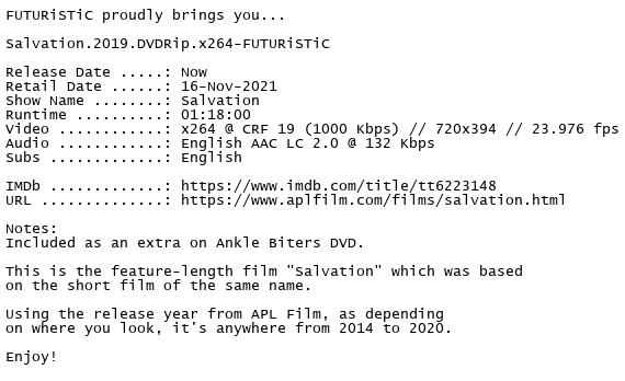 Release Name : Salvation.2019.DVDRip.x264-FUTURiSTiC