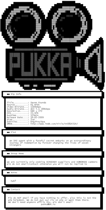 Release Name : Seven.Pounds.2008.DVDRip.XViD-PUKKA
