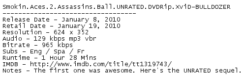 Release Name : Smokin.Aces.2.Assassins.Ball.2010.UNRATED.DVDRip.XviD-BULLDOZER