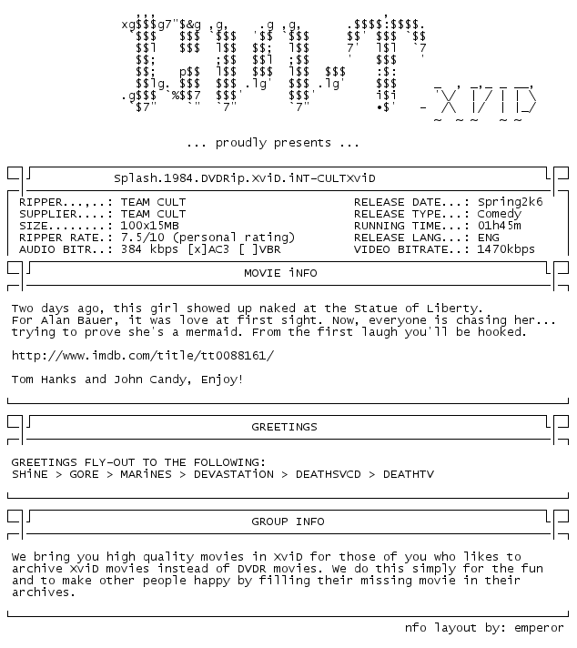 Release Name : Splash.1984.DVDRip.XviD.iNT-CULTXviD