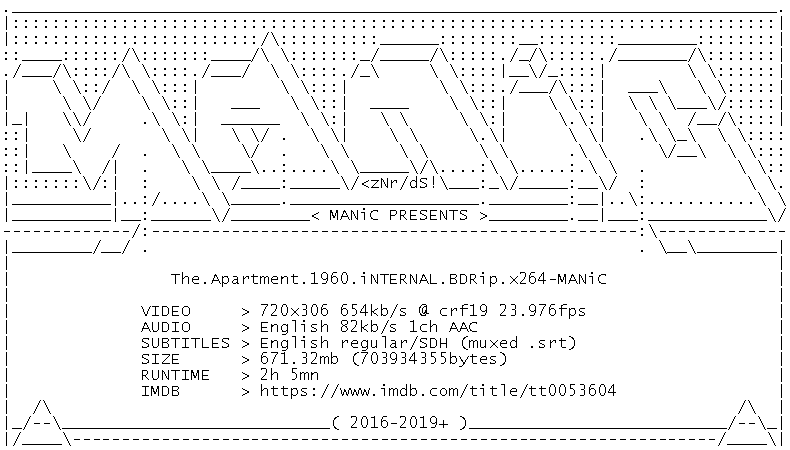 Release Name : The.Apartment.1960.iNTERNAL.BDRip.x264-MANiC