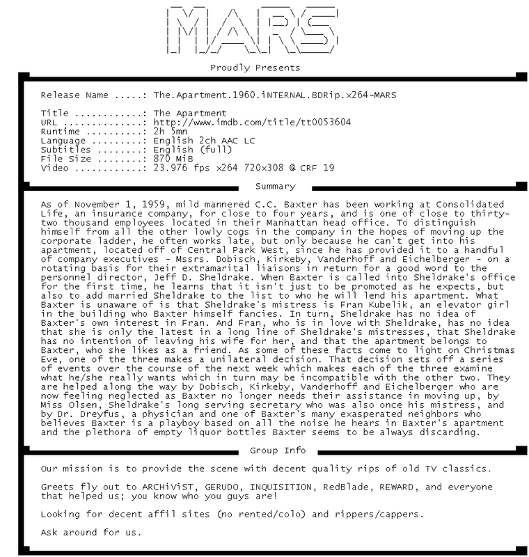 Release Name : The.Apartment.1960.iNTERNAL.BDRip.x264-MARS