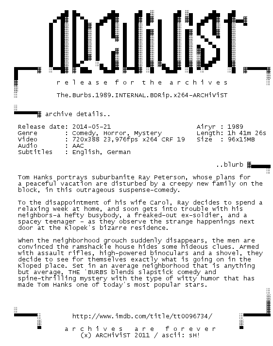 Release Name : The.Burbs.1989.INTERNAL.BDRip.x264-ARCHiViST
