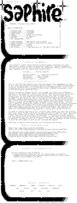 Release Name : The.Gold.Rush.1925.UNCUT.DVDRip.XviD-SAPHiRE