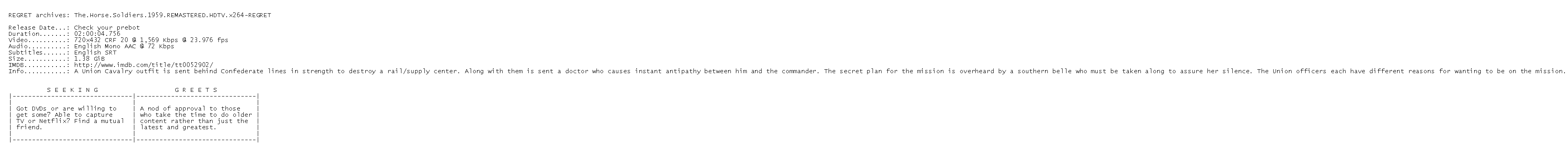 Release Name : The.Horse.Soldiers.1959.REMASTERED.HDTV.x264-REGRET